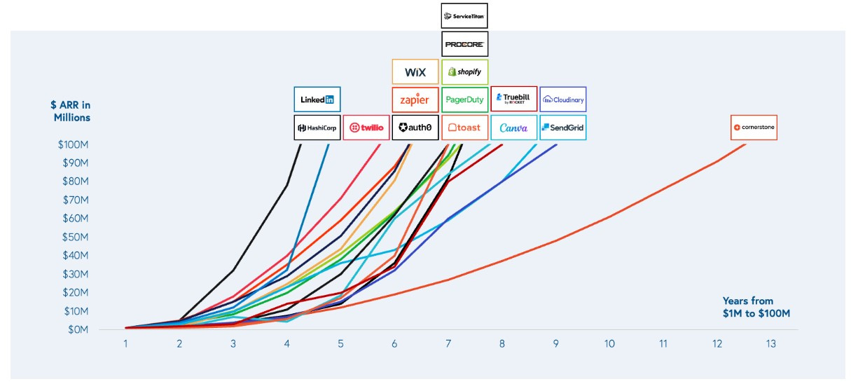 If you start at $1.5M ARR, this will take you to $4.5M in the first year, $13.5M in year 2, $27M in year 3, $54M in year 4, and $108M in year 5. While this sounds very mathematical, the infographic below shows a whole host of top-of-the-line SaaS companies that have achieved this.