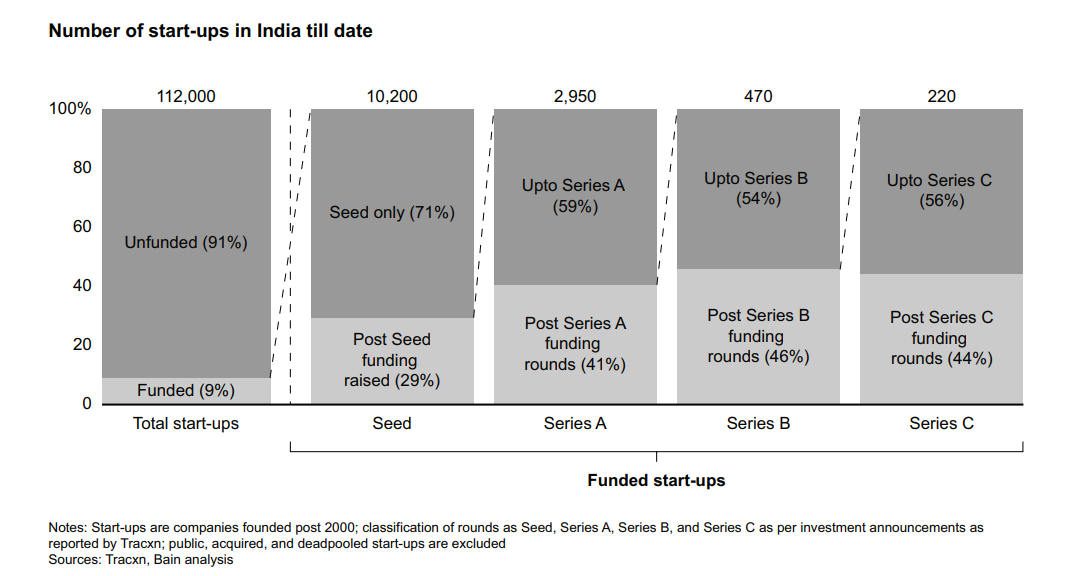 This infographic by Bain shows the number of startups that go on to raise a follow on round of funding. We can see that even after each level of market feedback, the ratio of success while moving up stages doesn’t grow meaningfully. At every stage, less than half of your cohort will be able to raise their next round of capital.